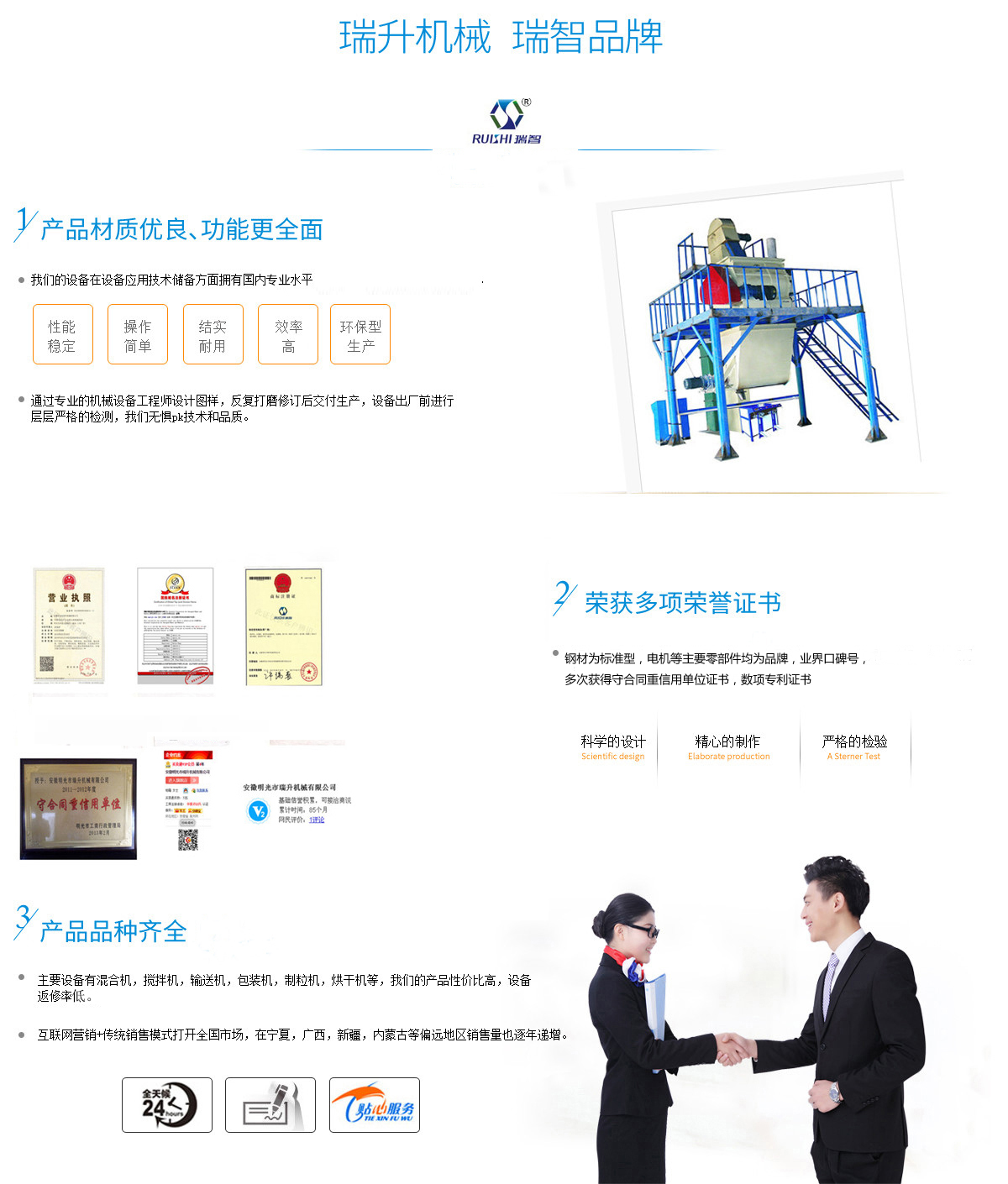 安徽瑞升機械制造有限公司坐落在明光市工業(yè)園區(qū),本公司產品主要用于粉料物質,顆粒物質的混合、攪拌、輸送、包裝的自動化生產設備。工廠占地面積為1萬多平方現有6000平方米的生產車間和各類加工檢測設備,具備產品開發(fā)、研制、設計、生產、試驗、倉儲運輸等能力,可以生產多種規(guī)格、多種非標定制的產品,并有多項技術獲得國家專利,擁有自主進出口權,公司憑借優(yōu)良的技術、先進的工藝和科學的管理理念,所生產的產品已暢銷全國各地,部分產品已進入馬耳他、印度尼西亞、韓國、羅馬尼亞、沙特阿拉伯、馬來西亞、印度、巴基斯坦、等國家和地區(qū),受到國內外客戶的高度認可和信賴。 本公司獲得守合同重信用單位證書,對原材料的采購極為細致,鋼材為標準型,電機等主要零部件均為品牌,數項專利證書。技術方面我司擁有一支國內的技術和管理團隊,在機械設備應用...公司資質榮譽